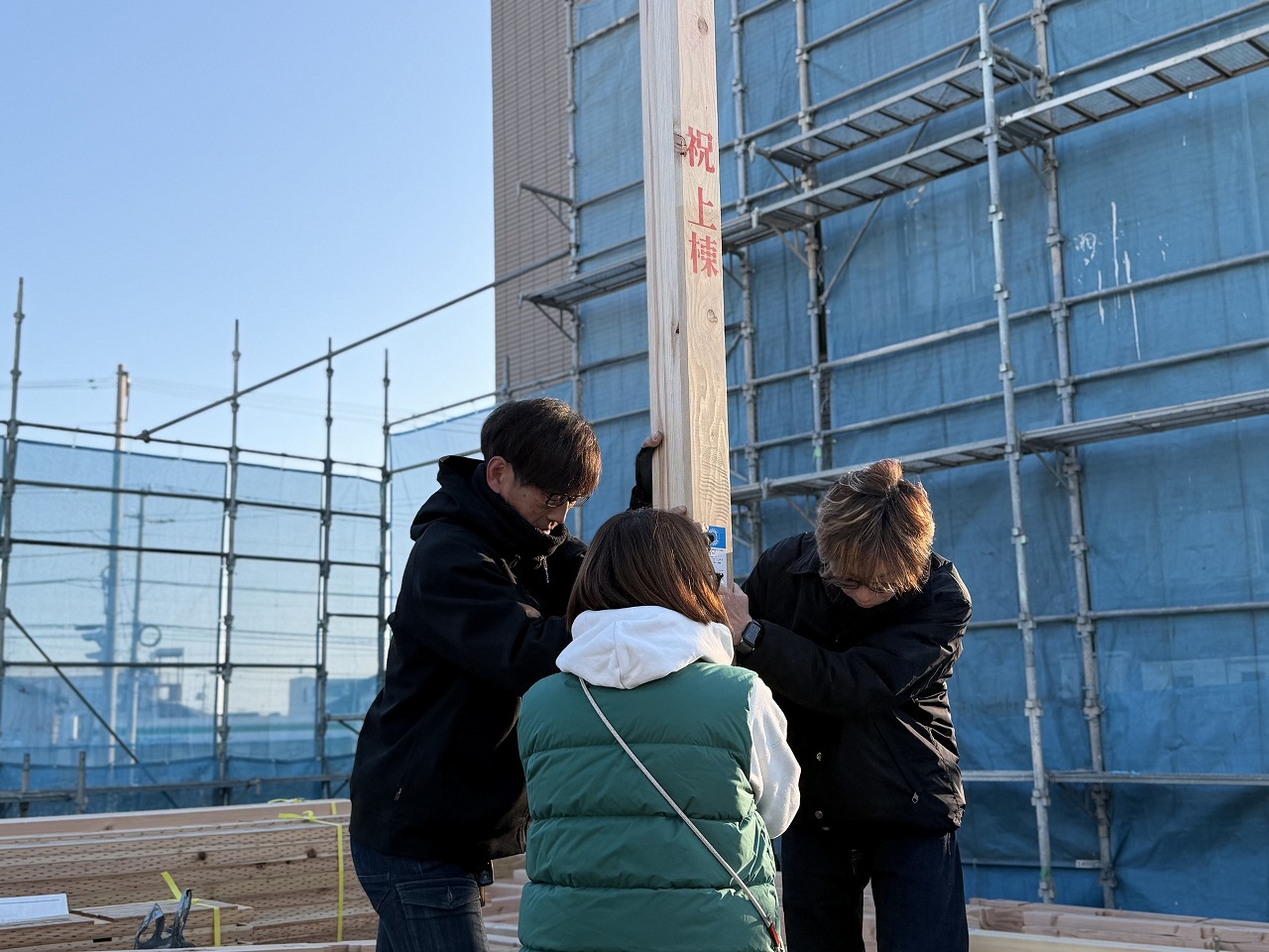 お施主様の「最初の1本目の柱建て」から。