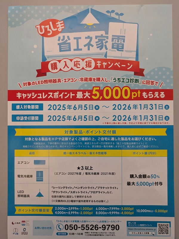 昨日、ホームセンターで照明器具を購入したのですが「ひろしま省エネ家電購入キャンペーン」