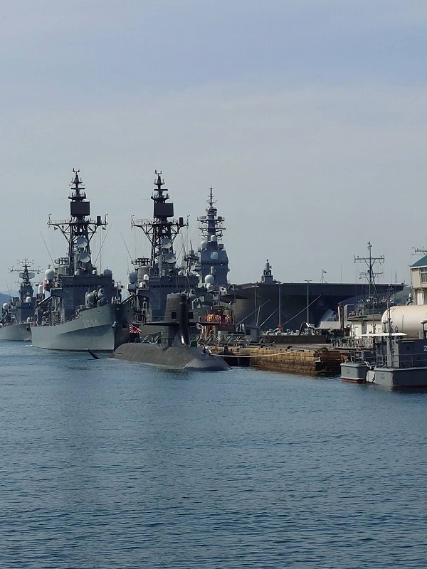 右側にみえる大きく四角い艦首は「護衛艦かが」です。