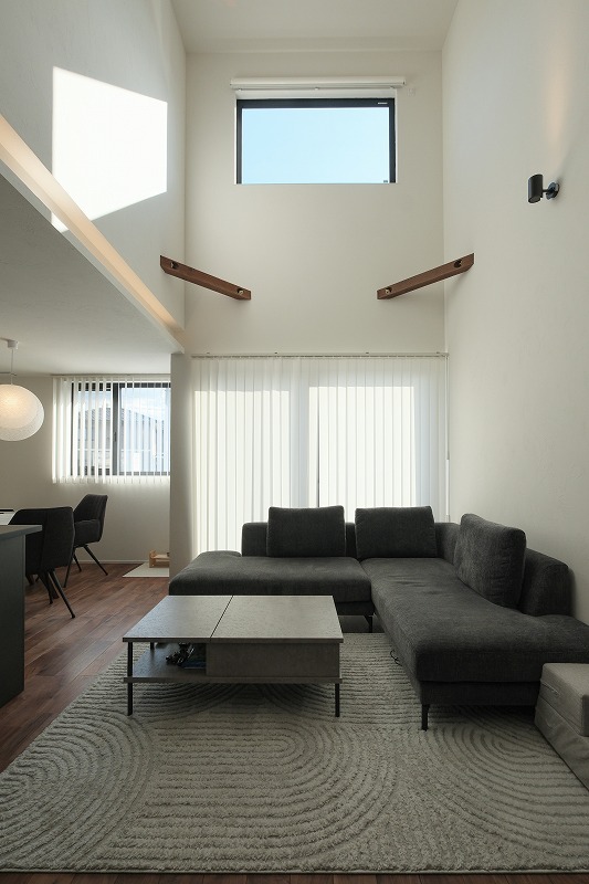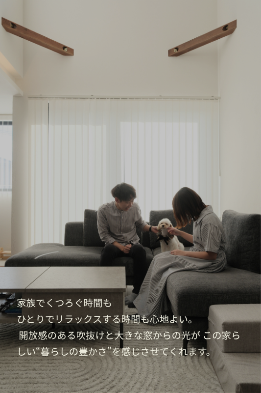 吹抜けの大きな窓から光が差し込む、明るく開放的なリビング。