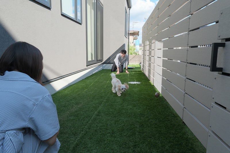 プライベート感のある人工芝の庭は、愛犬とのびのび遊べるスペース。