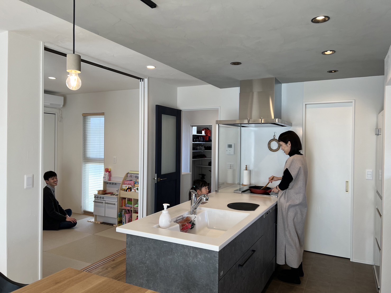 料理をしながらリビング全体が見渡せるので家族とのコミュニケーションがとても取りやすくなっています。南から日差しがはいるリビングは明るく開放的ですが、和室とお庭にあるウッドデッキと繋がることでより開放感が感じられます。さらにキッチンからは小さな子が和室で遊んでてもリビングで遊んでても目に入るので安心です。さらにさらに、子どもが小さなうちはおもちゃで散らかりがちですが、急な来客時には扉を閉めてしまえば隠すこともできます!一石三鳥です◎