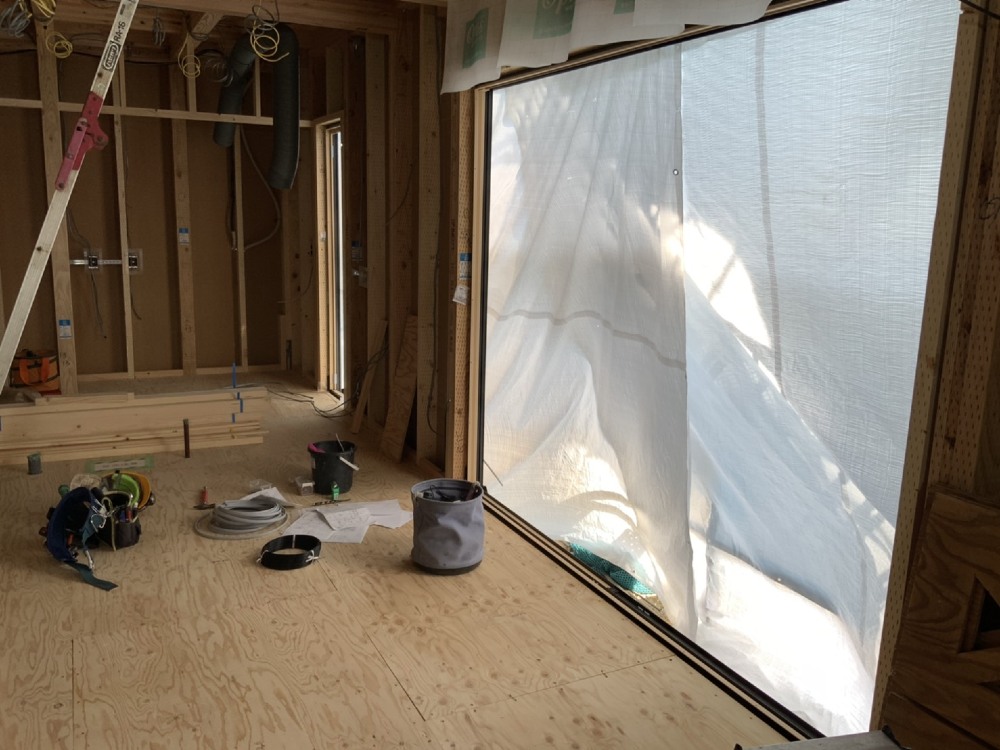 上棟が完了し、現場には窓が設置されました。外部は防水工事、外壁工事が進み、内部は大工工事が進んでいます。