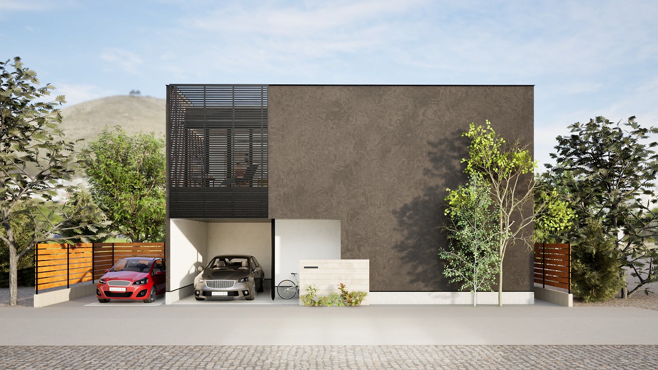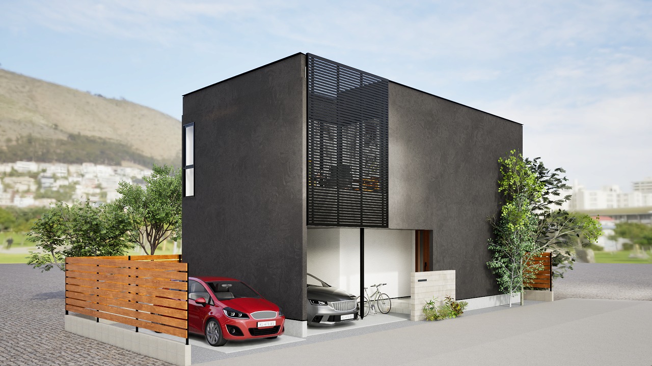黒のルーバーが外観を引き締め、外観に深い陰影と奥行きを与えています。