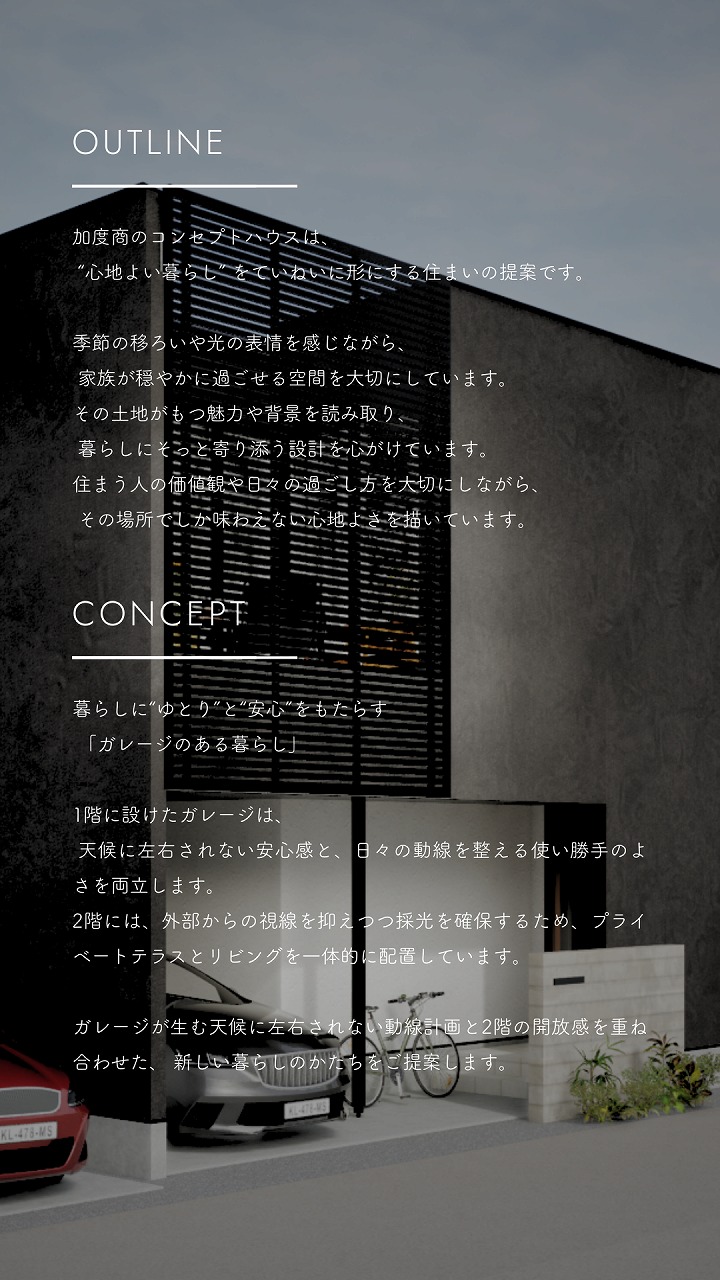 直線的な外観構成の中に、1階ガレージと2階のテラス+リビングを重ね合わせ、光とプライバシーを両立させた住まいです。