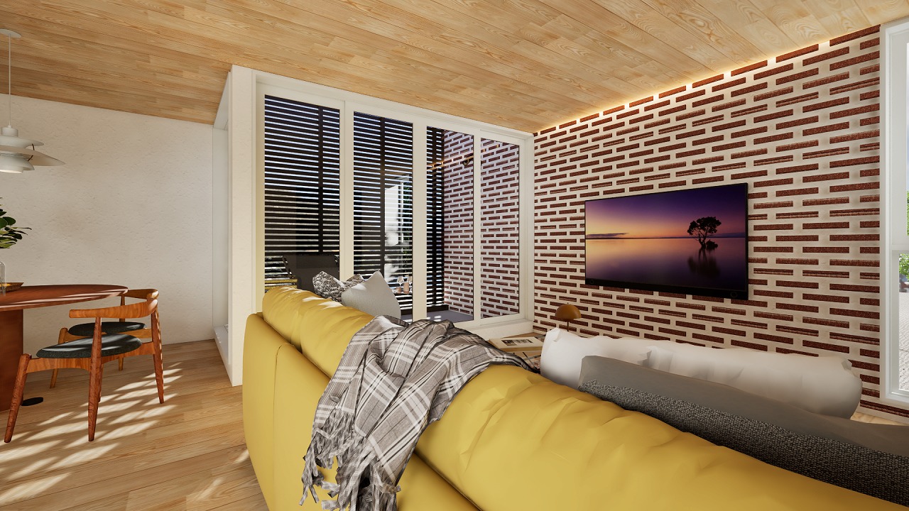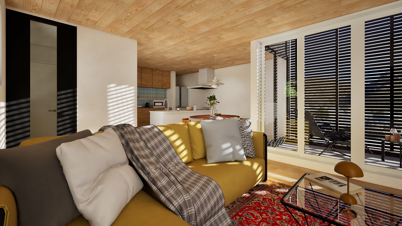 大開口とルーバーによって外部と室内の境界をゆるやかに調整し、リビングに奥行きが生まれます。