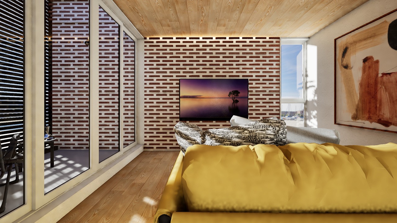 テレビを据える面に素材感を持たせることで、空間に重心が生まれ、全体のバランスを整えています。