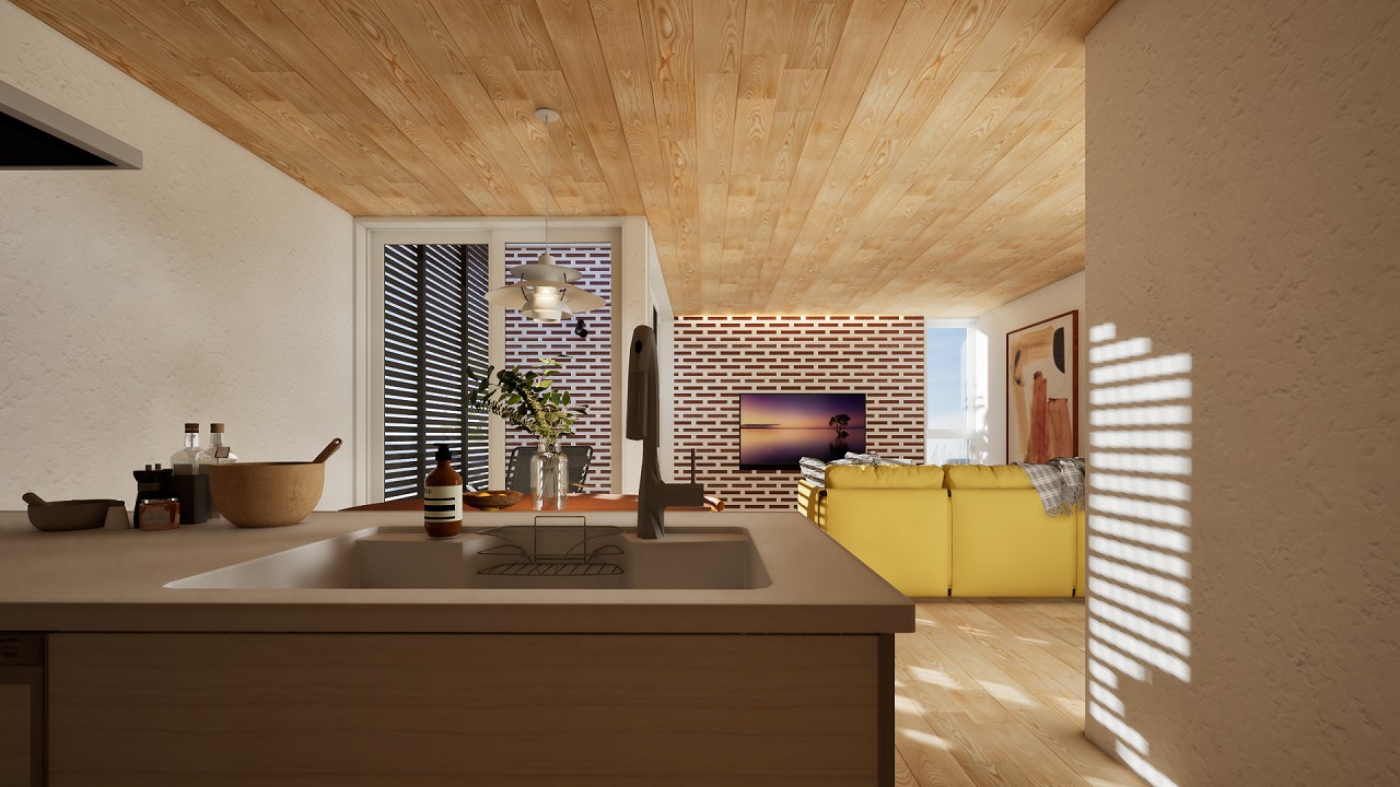 壁面のタイルがその表情を受け止め、家具の色を引き立てながら落ち着いたリズムをつくります。