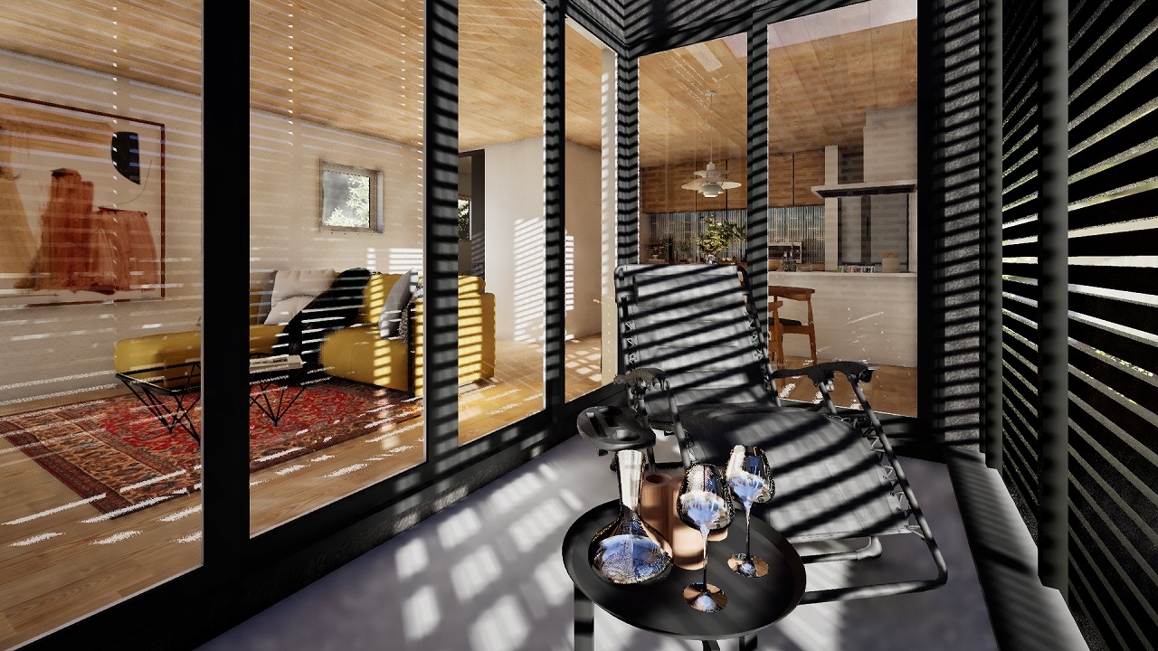 ルーバー越しの光が柔らかい陰影をつくり、外部からの視線を抑えながら開放感を確保した2階のテラス。