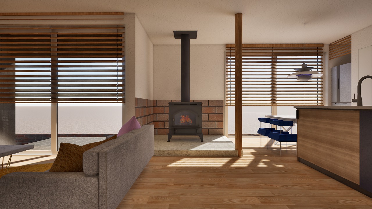 リビングに配置した薪ストーブが、住まい全体へやわらかな熱を届ける役割を担います。