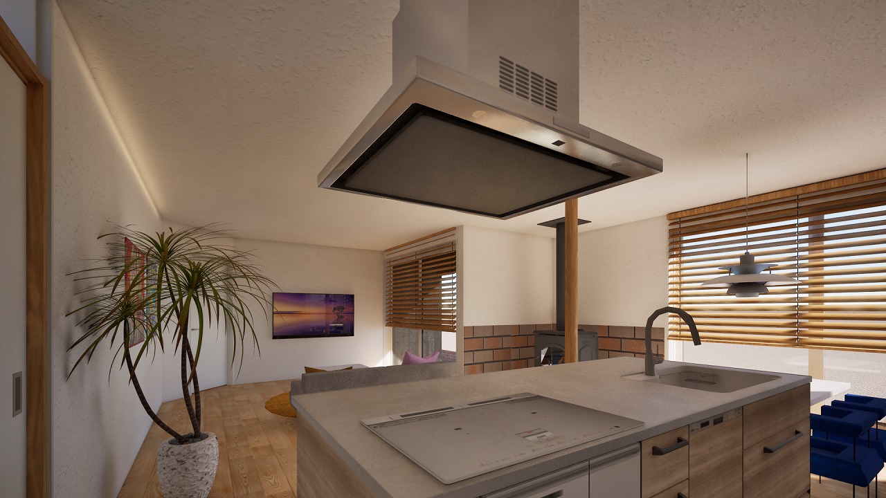 キッチンからリビングやダイニング、薪ストーブのある空間へと、視線と動線が自然に広がるよう計画しました。
