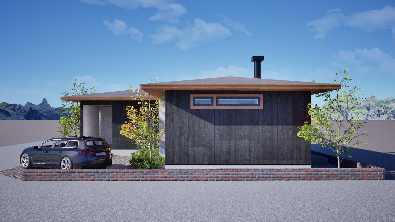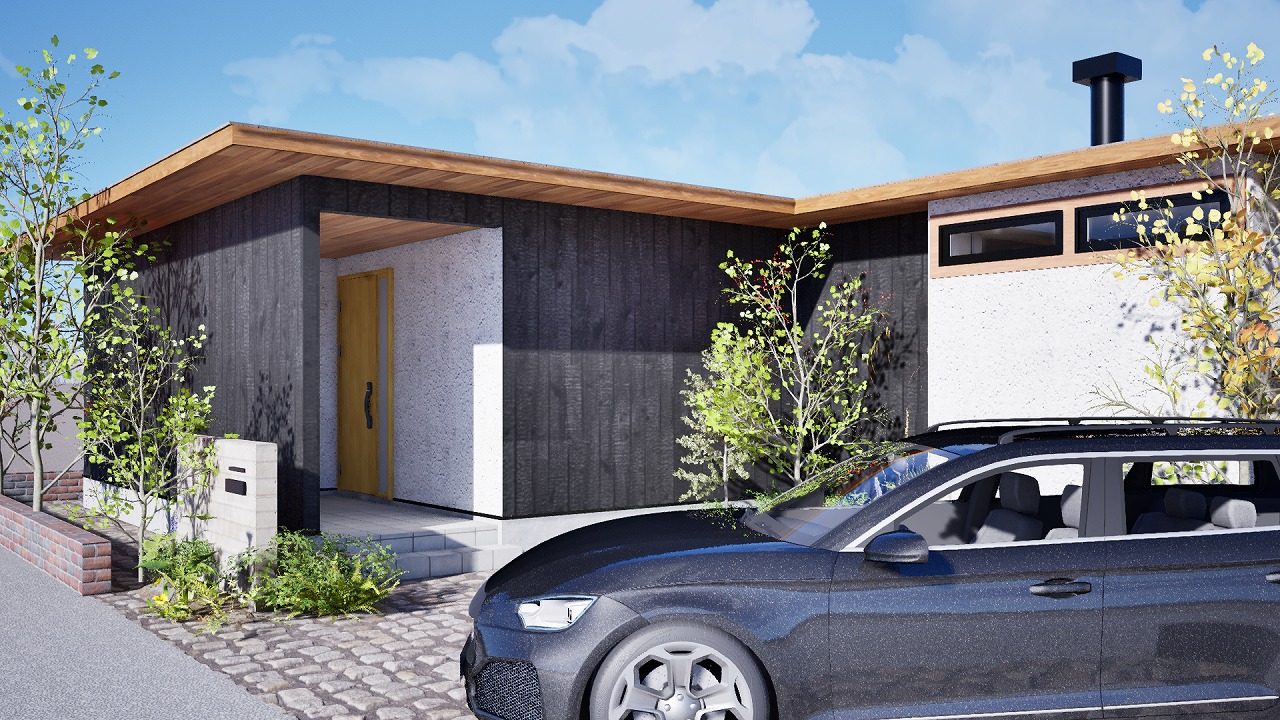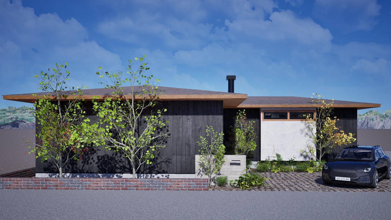 焼杉の外壁と寄棟屋根が落ち着きを漂わせる平屋。薪ストーブのぬくもりが暮らしに寄り添う、上質な住まいです。