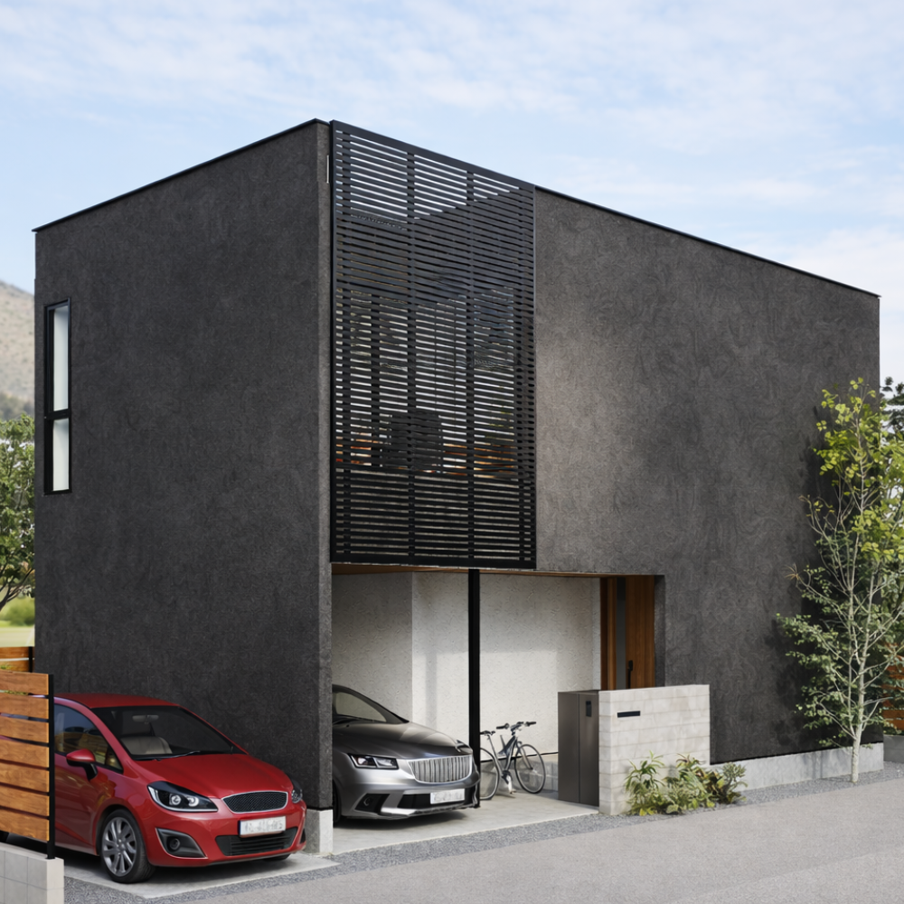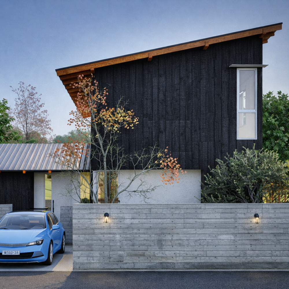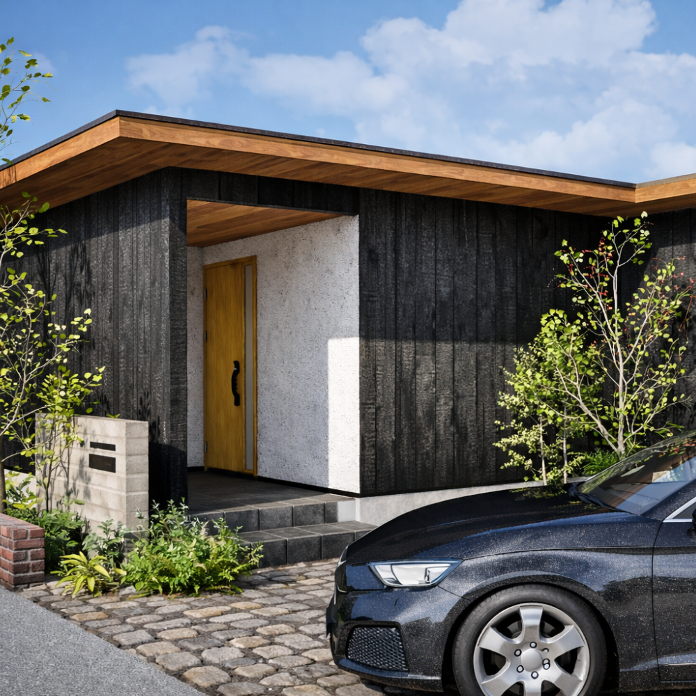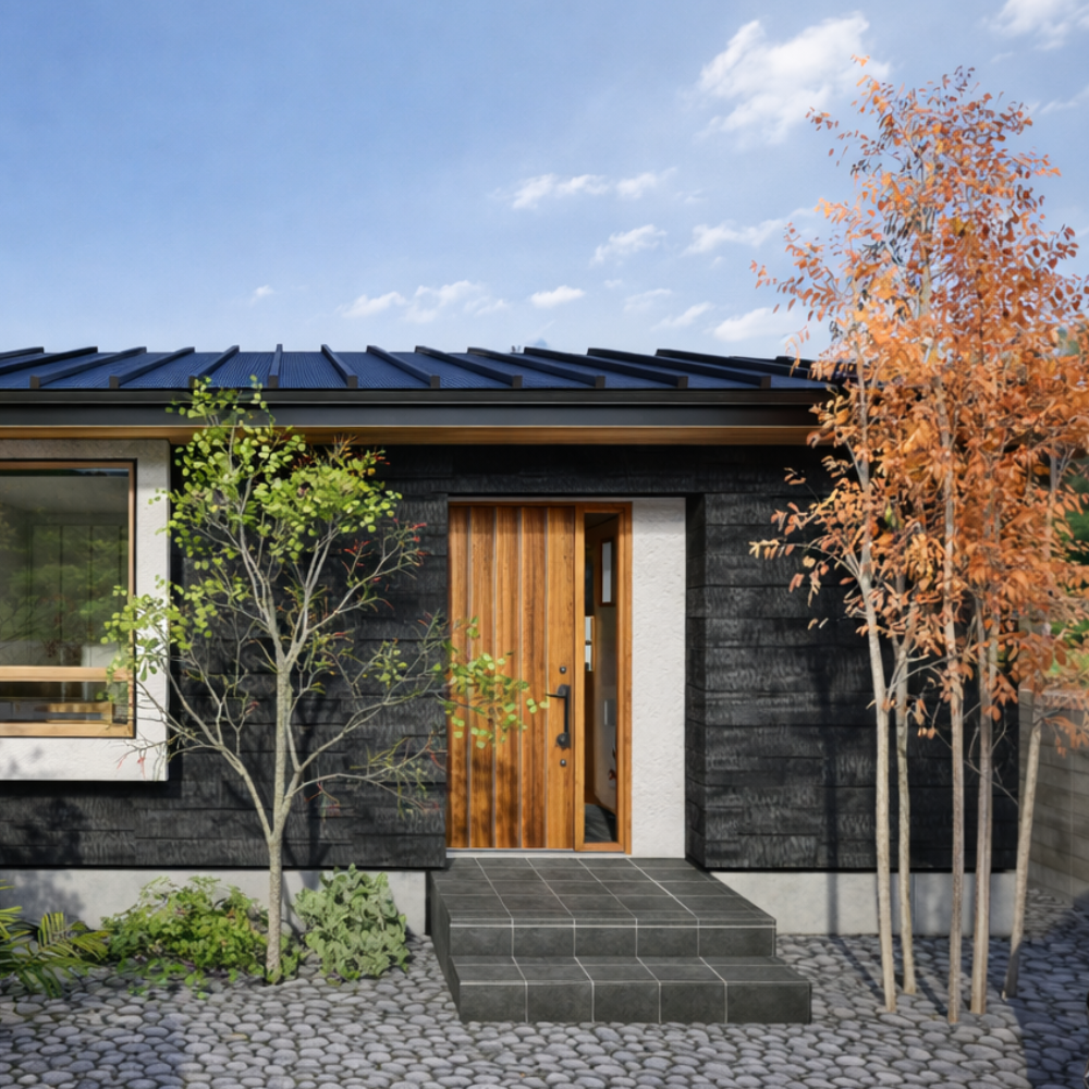 焼杉の存在感と 焼杉の重厚な外観と |