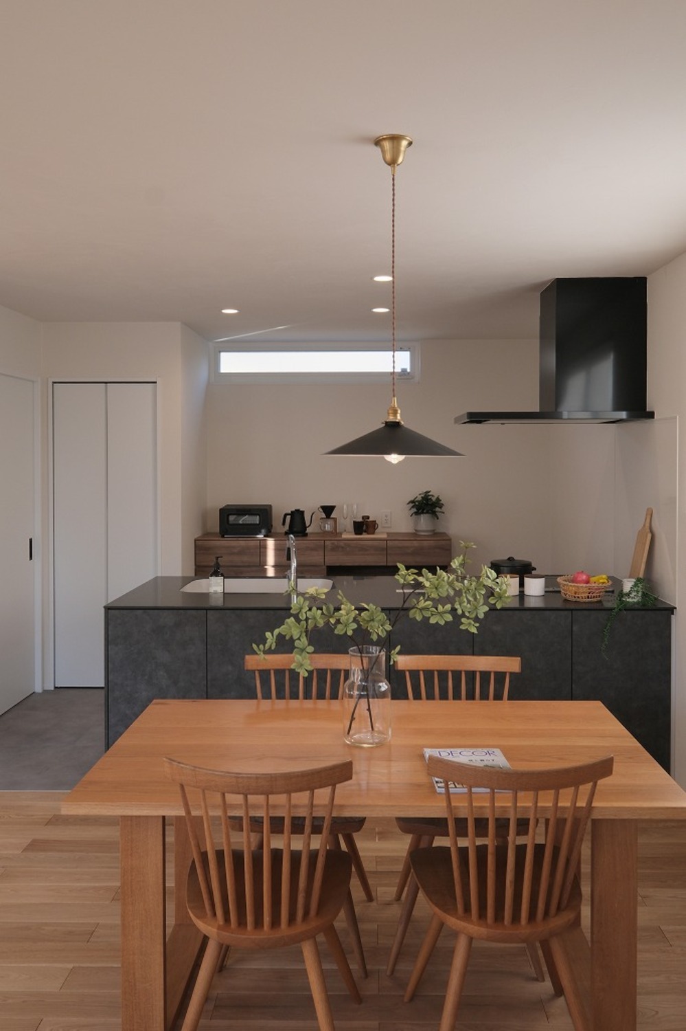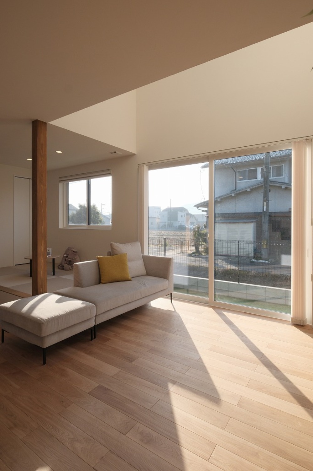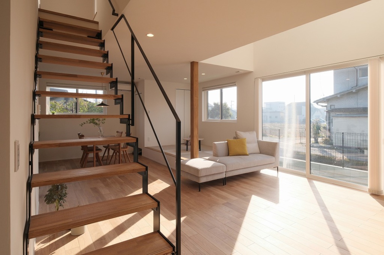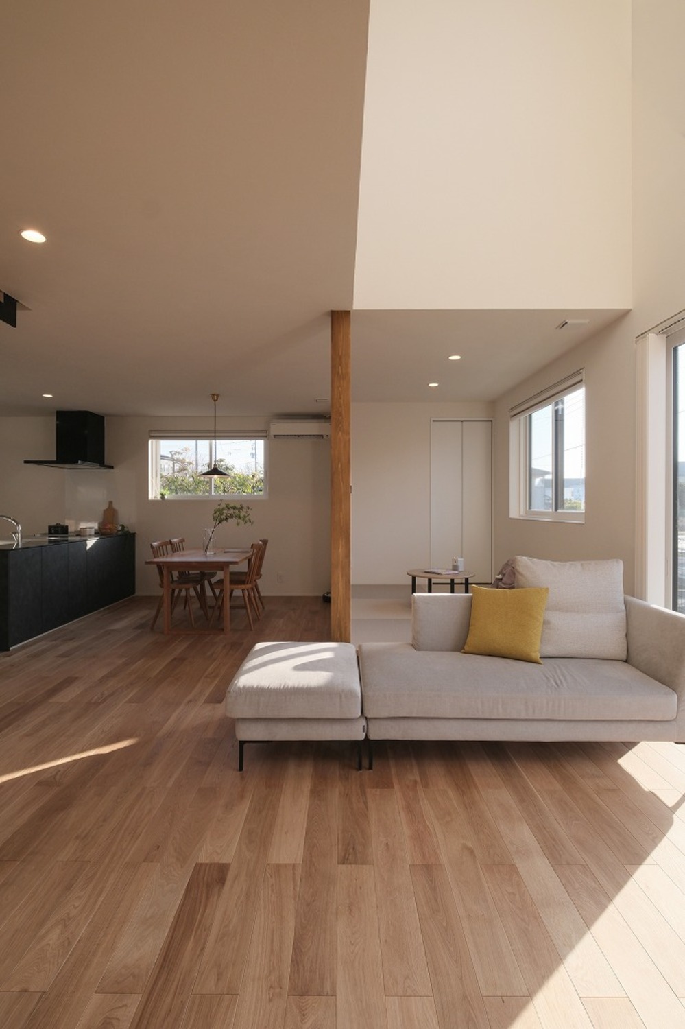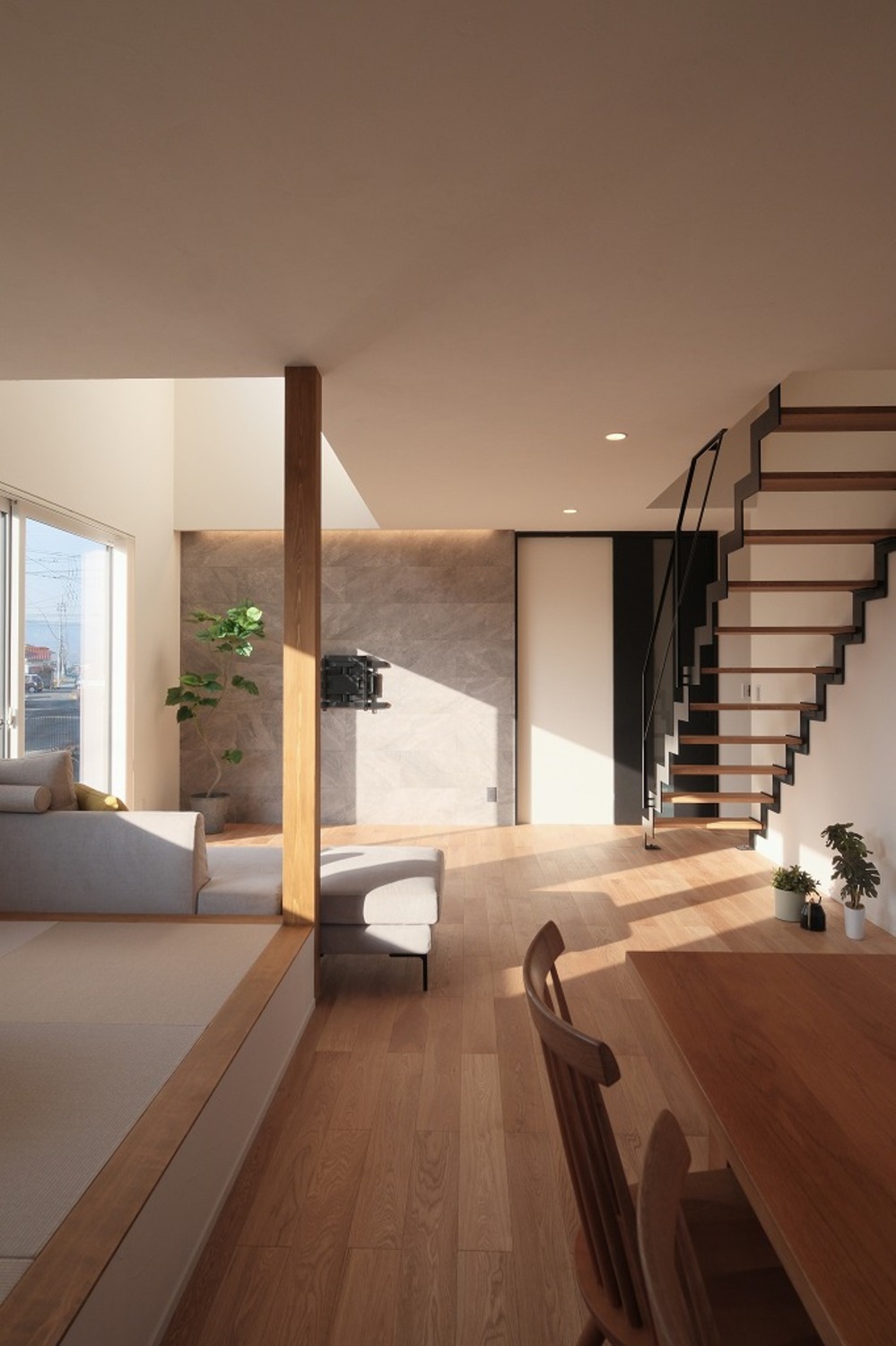 ホーム 写真集 完成物件 すべて No.259 中庭と吹抜でカーテンレスな暮らし No.259 中庭と吹抜でカーテンレスな暮らし 福山市 完成物件|すべて ソファに座ると、自然光が床まできれいに届くLDK。中庭と吹抜があることで、外からの視線を遮りながらも、明るさはしっかり確保しています。画像のみを表示全 15 枚中 1 枚目を表示Next ≫ 洗面台は既製品に頼らず、空間寸法に合わせて造作。ミラー裏収納と下部のオープン棚で、見た目と使いやすさを両立しています。画像のみを表示全 15 枚中 2 枚目を表示≪ Prev|Next ≫ リビングとつながる小上がり畳は、こどもが遊んだり、お昼寝をしたりするのにちょうどいい場所。段差があることで、大人は腰掛けやすく、家族それぞれが思い思いに過ごせる空間になりました。画像のみを表示全 15 枚中 3 枚目を表示≪ Prev|Next ≫ ダイニングとキッチンがゆるやかにつながる、すっきりとした空間。手元を照らすペンダント照明と、高窓から入るやわらかな自然光が、心地よい明るさをつくります。画像のみを表示全 15 枚中 4 枚目を表示≪ Prev|Next ≫ ソファに座ると、やわらかな光が部屋いっぱいに広がります。日中は照明をつけなくても、自然光だけで心地よく過ごせるリビングです。画像のみを表示全 15 枚中 5 枚目を表示≪ Prev|Next ≫ 木と鉄を組み合わせた鉄骨階段。踏板の抜けと細い手すりが、空間に圧迫感を与えず、光と視線を通します。画像のみを表示全 15 枚中 6 枚目を表示≪ Prev|Next ≫ ダイニングで過ごす時間と、畳で遊ぶこどもの時間。同じ空間の中で、それぞれが心地よく過ごせる配置です。画像のみを表示全 15 枚中 7 枚目を表示≪ Prev|Next ≫ ソファに座っても、ダイニングにいても、自然光の気配を感じられる空間。段差や素材の切り替えで場所を分けながら、家族それぞれが心地よく過ごせるLDKになりました。画像のみを表示全 15 枚中 8 枚目を表示≪ Prev|Next ≫ キッチンの後ろには、使い勝手を考えた造作カップボードを配置。よく使う家電や食器をまとめて置けるので、作業動線が短く、毎日の家事がスムーズです。見た目と実用性、どちらも大切にしました。画像のみを表示全 15 枚中 9 枚目を表示≪ Prev|Next ≫ 鉄骨階段がLDKにほどよい抜けとリズムをつくります。視線を遮らないことで、リビングからダイニングまで空間がひと続きに感じられ、自然光も家全体に広がります。画像のみを表示全 15 枚中 10 枚目を表示≪ Prev|Next ≫ グレーの壁材と木の床を組み合わせた、落ち着きのあるトイレ空間。素材の表情が引き立つよう、照明はあえてシンプルに。画像のみを表示全 15 枚中 11 枚目を表示≪ Prev|Next ≫ 洗濯が終わったら、そのまま掛けて、そのまま収納。重たい洗濯物を持って家の中を移動する必要がありません。家事の「ひと手間」を減らすことで、気持ちにも時間にも余裕が生まれます。画像のみを表示全 15 枚中 12 枚目を表示≪ Prev|Next ≫ 手すり壁の笠木は、あえて厚みを抑えた仕様に。ラインを細く見せることで、空間全体がすっきりと軽やかに感じられます。さりげない部分ですが、印象を左右するディテールです。画像のみを表示全 15 枚中 13 枚目を表示≪ Prev|Next ≫ 道路側からの視線を抑えつつ、中庭と吹抜を中心に光を取り込むことで、カーテンに頼らない明るく開放的な暮らしを実現しました。画像のみを表示全 15 枚中 14 枚目を表示≪ Prev|Next ≫ 白とチャコールグレーを組み合わせた、シンプルで端正な外観。画像のみを表示全 15 枚中 15 枚目を表示≪ Prev 一覧へ戻る 完成物件 リフォーム・リノベーション 店舗・事務所 平屋 すべて 尾道市 福山市 三原市 一覧 一覧 一覧
