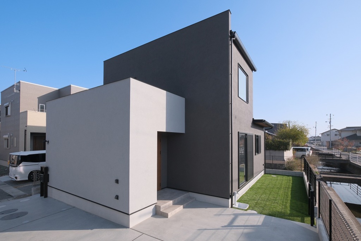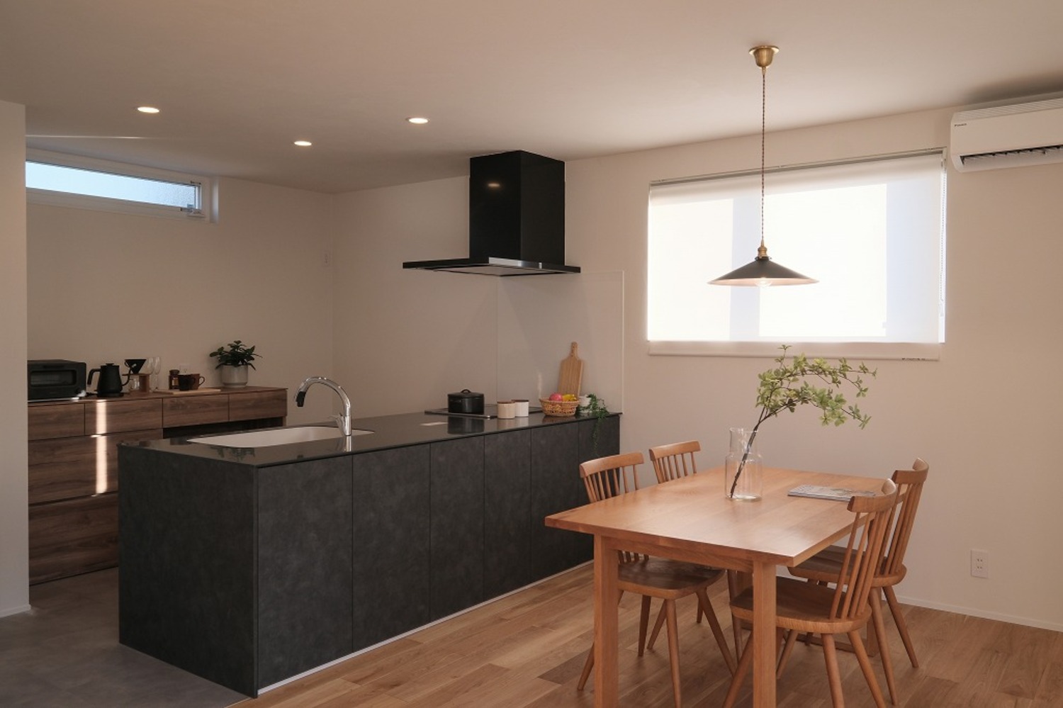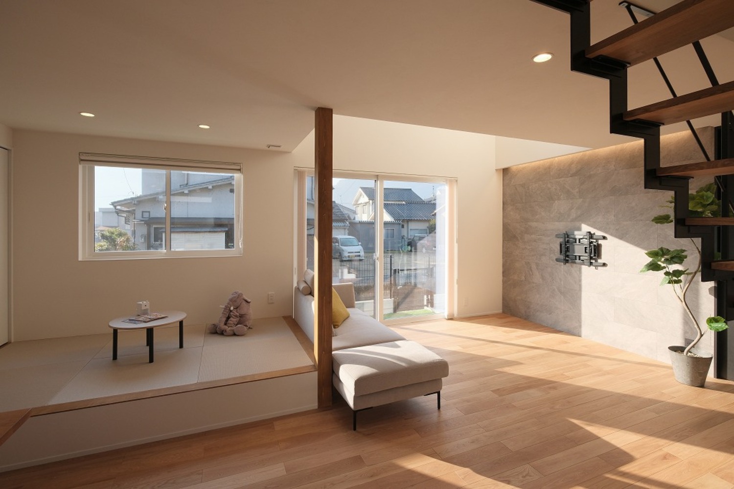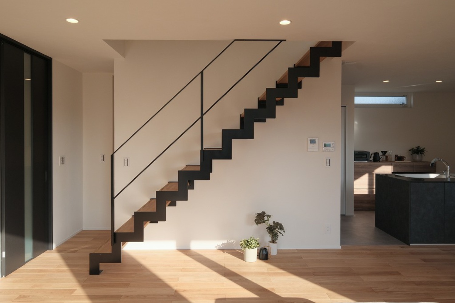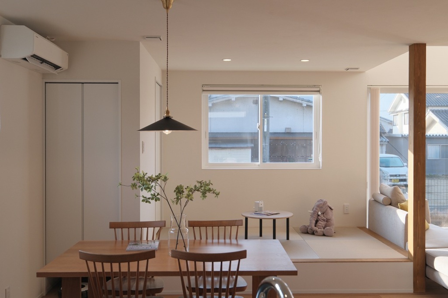 ホーム 写真集 完成物件 すべて No.259 中庭と吹抜でカーテンレスな暮らし No.259 中庭と吹抜でカーテンレスな暮らし 福山市 完成物件|すべて ソファに座ると、自然光が床まできれいに届くLDK。中庭と吹抜があることで、外からの視線を遮りながらも、明るさはしっかり確保しています。画像のみを表示全 15 枚中 1 枚目を表示Next ≫ 洗面台は既製品に頼らず、空間寸法に合わせて造作。ミラー裏収納と下部のオープン棚で、見た目と使いやすさを両立しています。画像のみを表示全 15 枚中 2 枚目を表示≪ Prev|Next ≫ リビングとつながる小上がり畳は、こどもが遊んだり、お昼寝をしたりするのにちょうどいい場所。段差があることで、大人は腰掛けやすく、家族それぞれが思い思いに過ごせる空間になりました。画像のみを表示全 15 枚中 3 枚目を表示≪ Prev|Next ≫ ダイニングとキッチンがゆるやかにつながる、すっきりとした空間。手元を照らすペンダント照明と、高窓から入るやわらかな自然光が、心地よい明るさをつくります。画像のみを表示全 15 枚中 4 枚目を表示≪ Prev|Next ≫ ソファに座ると、やわらかな光が部屋いっぱいに広がります。日中は照明をつけなくても、自然光だけで心地よく過ごせるリビングです。画像のみを表示全 15 枚中 5 枚目を表示≪ Prev|Next ≫ 木と鉄を組み合わせた鉄骨階段。踏板の抜けと細い手すりが、空間に圧迫感を与えず、光と視線を通します。画像のみを表示全 15 枚中 6 枚目を表示≪ Prev|Next ≫ ダイニングで過ごす時間と、畳で遊ぶこどもの時間。同じ空間の中で、それぞれが心地よく過ごせる配置です。画像のみを表示全 15 枚中 7 枚目を表示≪ Prev|Next ≫ ソファに座っても、ダイニングにいても、自然光の気配を感じられる空間。段差や素材の切り替えで場所を分けながら、家族それぞれが心地よく過ごせるLDKになりました。画像のみを表示全 15 枚中 8 枚目を表示≪ Prev|Next ≫ キッチンの後ろには、使い勝手を考えた造作カップボードを配置。よく使う家電や食器をまとめて置けるので、作業動線が短く、毎日の家事がスムーズです。見た目と実用性、どちらも大切にしました。画像のみを表示全 15 枚中 9 枚目を表示≪ Prev|Next ≫ 鉄骨階段がLDKにほどよい抜けとリズムをつくります。視線を遮らないことで、リビングからダイニングまで空間がひと続きに感じられ、自然光も家全体に広がります。画像のみを表示全 15 枚中 10 枚目を表示≪ Prev|Next ≫ グレーの壁材と木の床を組み合わせた、落ち着きのあるトイレ空間。素材の表情が引き立つよう、照明はあえてシンプルに。画像のみを表示全 15 枚中 11 枚目を表示≪ Prev|Next ≫ 洗濯が終わったら、そのまま掛けて、そのまま収納。重たい洗濯物を持って家の中を移動する必要がありません。家事の「ひと手間」を減らすことで、気持ちにも時間にも余裕が生まれます。画像のみを表示全 15 枚中 12 枚目を表示≪ Prev|Next ≫ 手すり壁の笠木は、あえて厚みを抑えた仕様に。ラインを細く見せることで、空間全体がすっきりと軽やかに感じられます。さりげない部分ですが、印象を左右するディテールです。画像のみを表示全 15 枚中 13 枚目を表示≪ Prev|Next ≫ 道路側からの視線を抑えつつ、中庭と吹抜を中心に光を取り込むことで、カーテンに頼らない明るく開放的な暮らしを実現しました。画像のみを表示全 15 枚中 14 枚目を表示≪ Prev|Next ≫ 白とチャコールグレーを組み合わせた、シンプルで端正な外観。画像のみを表示全 15 枚中 15 枚目を表示≪ Prev 一覧へ戻る 完成物件 リフォーム・リノベーション 店舗・事務所 平屋 すべて 尾道市 福山市 三原市 一覧 一覧 一覧