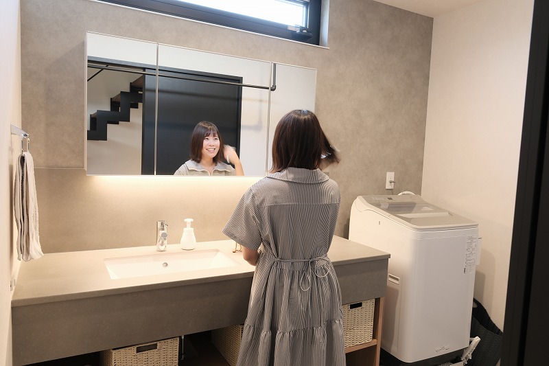 奥様:すぐに乾いた洗濯物を収納できるように、洗面の横をファミクロにしたんです。すごい使いやすくて!洗面台も広いから洗濯物も畳みやすいし、この間取りにしてよかったです。