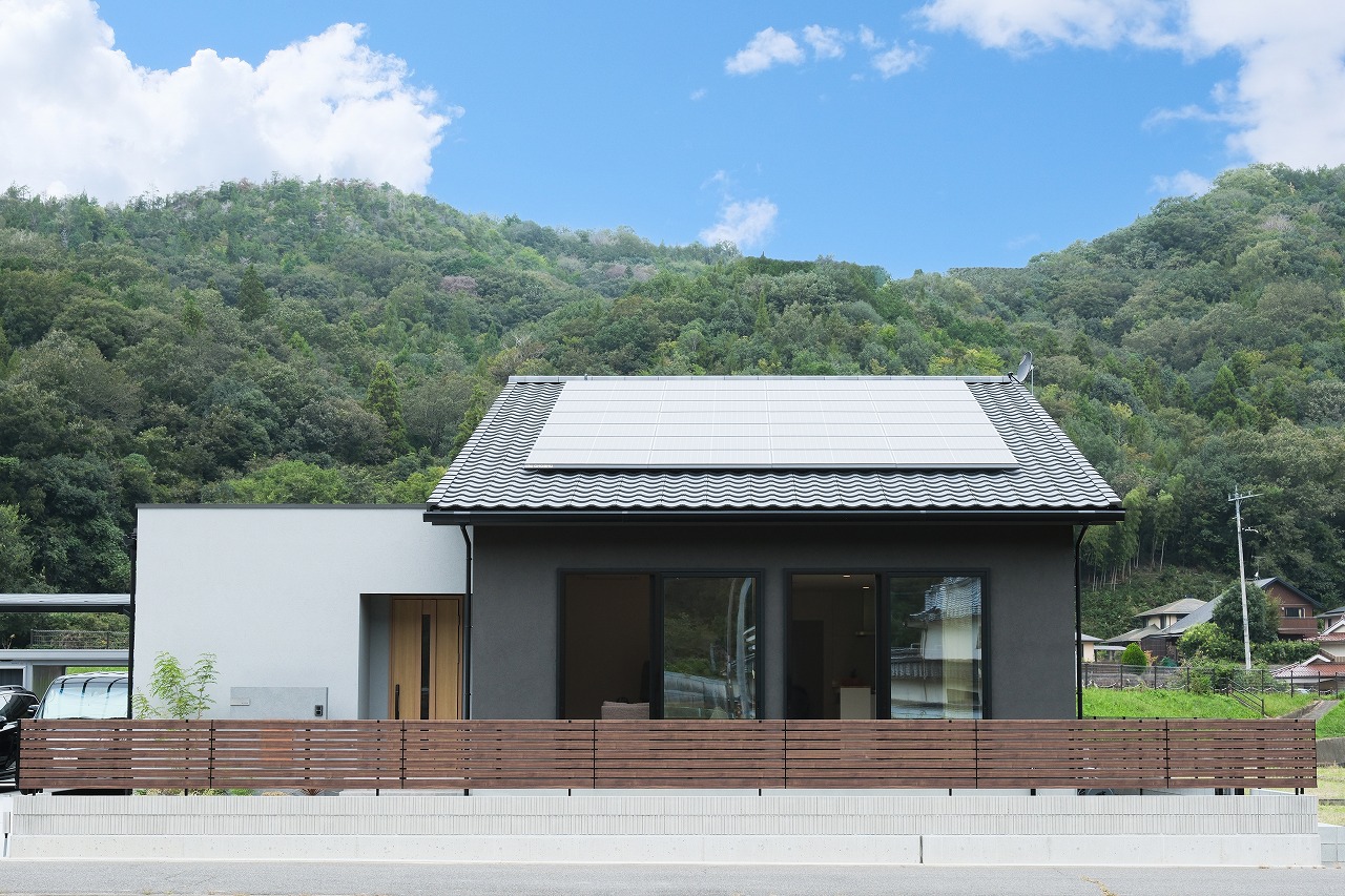 【外観】屋根全面に広がる太陽光パネルが印象的。外観デザインを損なわず、すっきりとした一体感があります。片流れ屋根の角度を活かして、効率よく発電できる設計です。