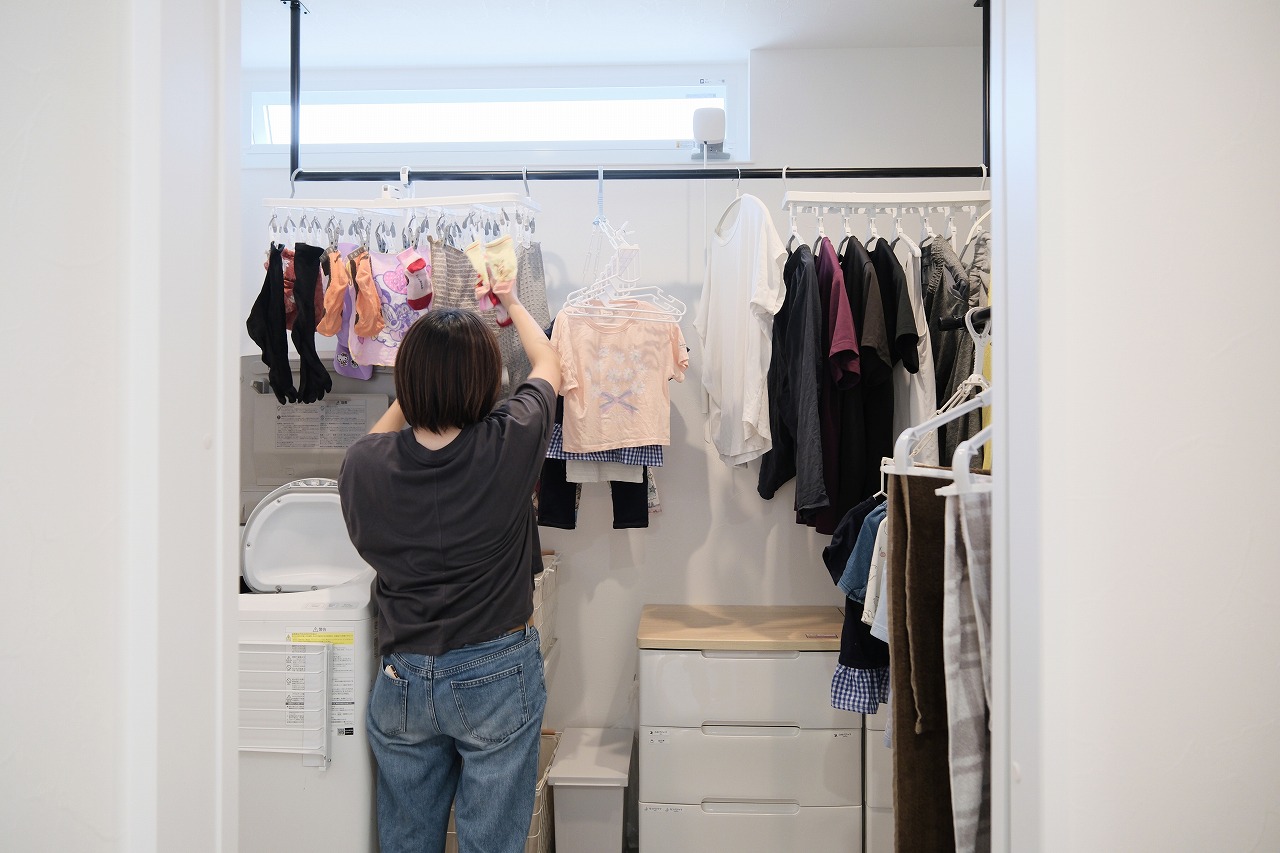 奥様:洗濯は洗うのも干すのも全部脱衣室で済ませて、そのままファミリークローゼットに収納できるので、その動線がすごく楽です。ドアを開けておけばちゃんと乾くしね。