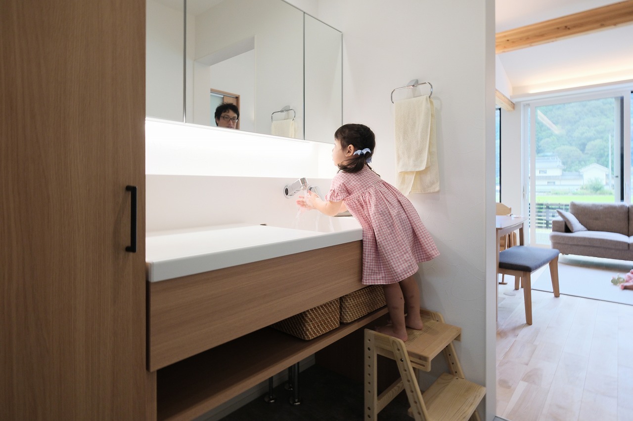 奥様:洗面台の下に、何センチと何センチのかごを入れたいから、棚の高さを何センチにしたいとか、「洗面台の下にこの踏み台を入れたい」とお伝えししたら、その高さにあった洗面台にしてくださって。細かい高さなどをこだわることができて、すごく満足しています。