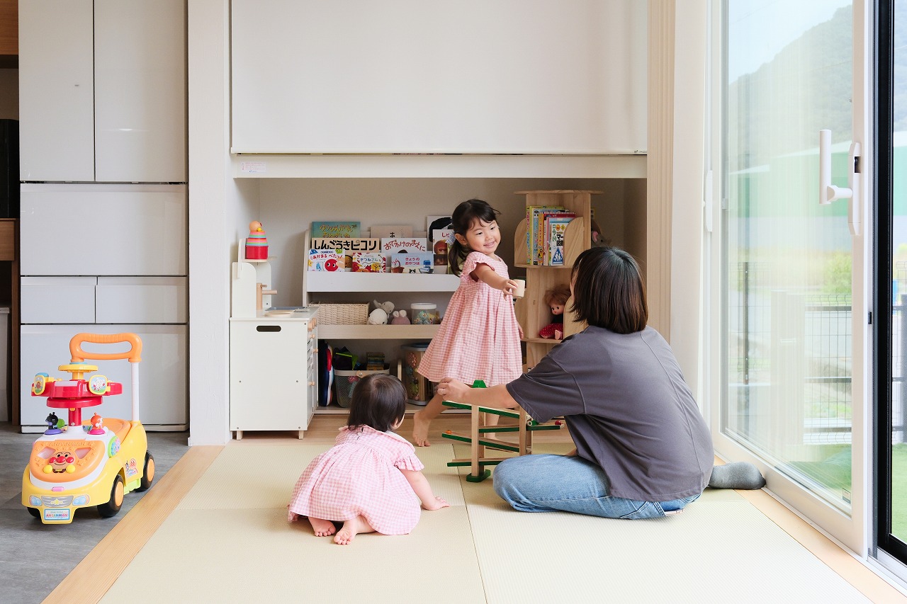 奥様:「畳のスペースすごい良いね」って言われます。ちょっとでも畳があると、すごい居心地がいいねって。ママ友たちともこの家で集まることが多いんですけど、子どもたちも安心して遊べて畳にして大正解でした。